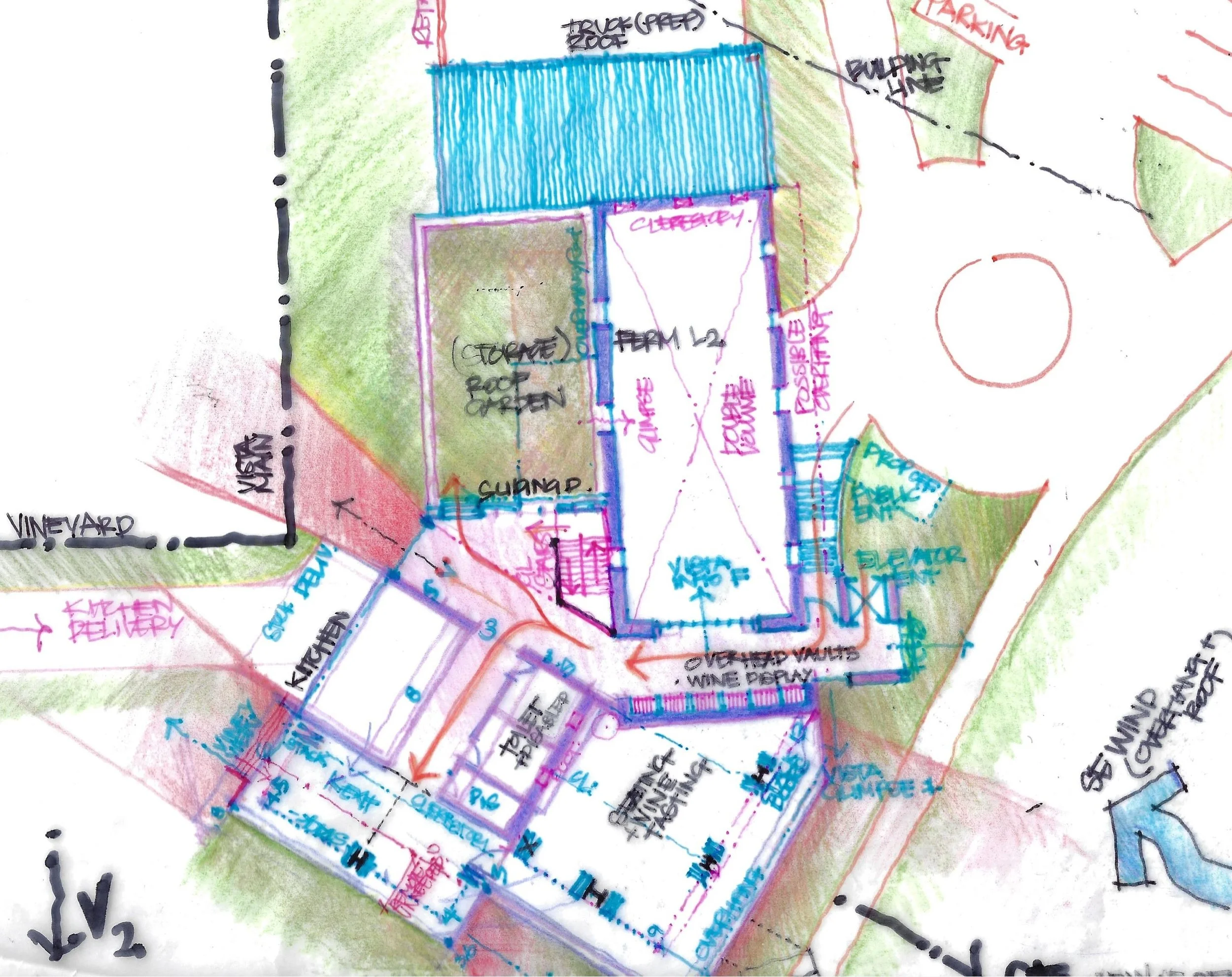 In this way, the architecture invites visitors to participate in the narrative of the estate: a gradual unfolding from cultivation to craft, culminating in a shared moment of celebration. This guiding idea was first explored in the early first-floor concept sketch illustrated below.
