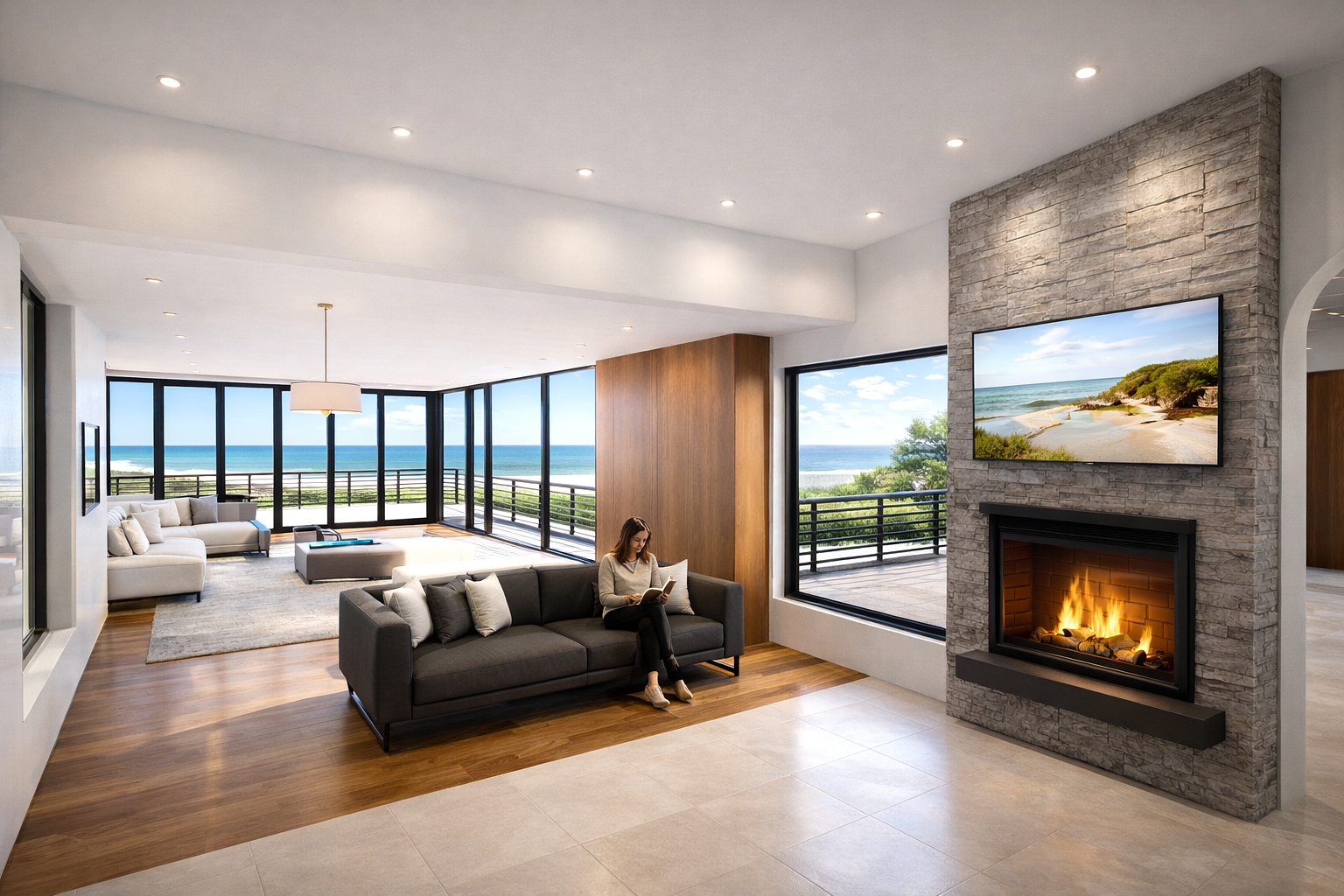 The addition establishes a continuous, breathable sequence of spaces that expand the life of the house toward the landscape and sea beyond. A new double garage, a master bedroom with en-suite, and a living room that projects toward the coastal view form the core of the intervention, accompanied by further carefully integrated expansions. Together, these elements reinterpret the home for its next chapter, shaping a more personal and considered response to the couple’s evolving way of living.