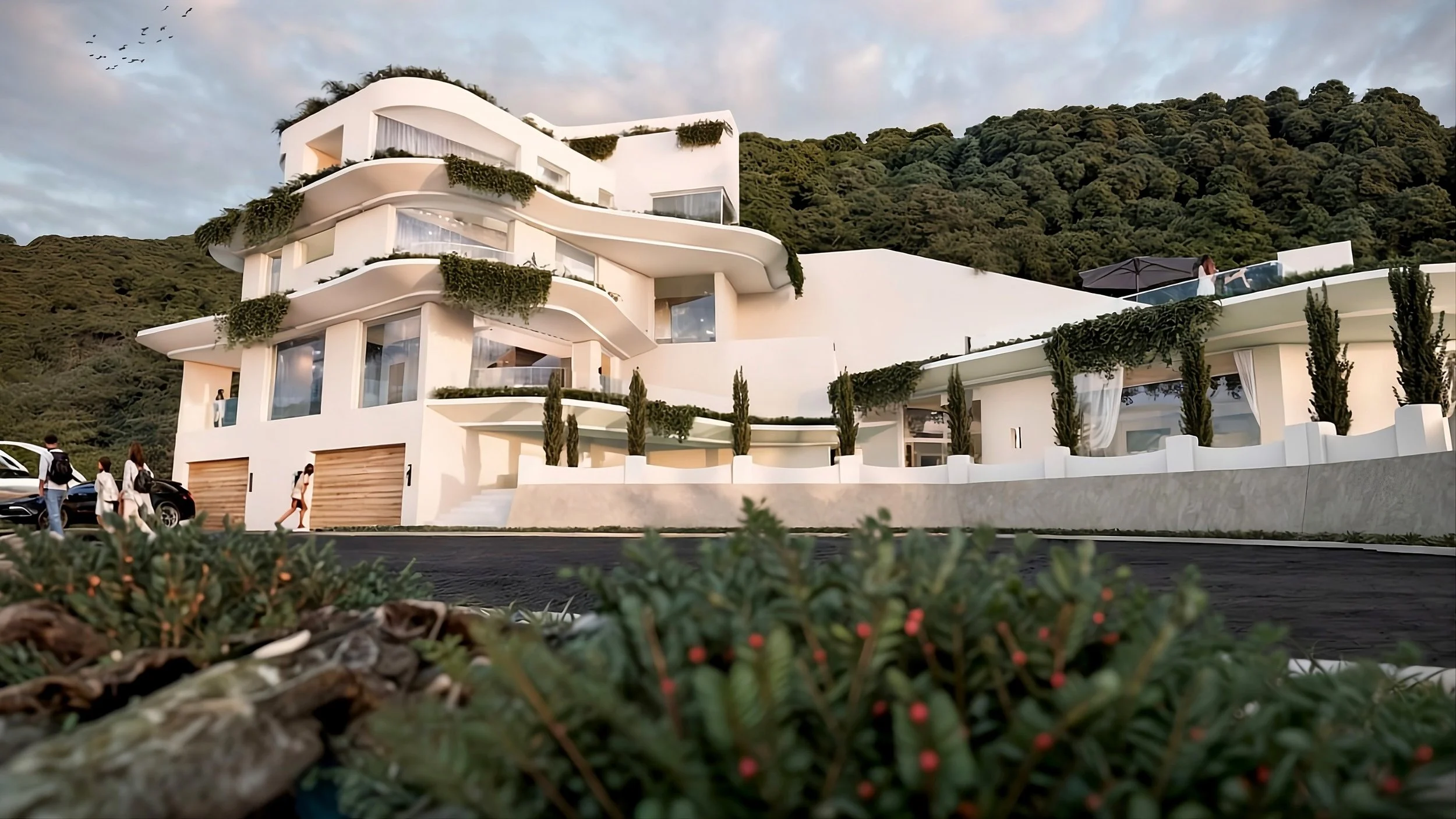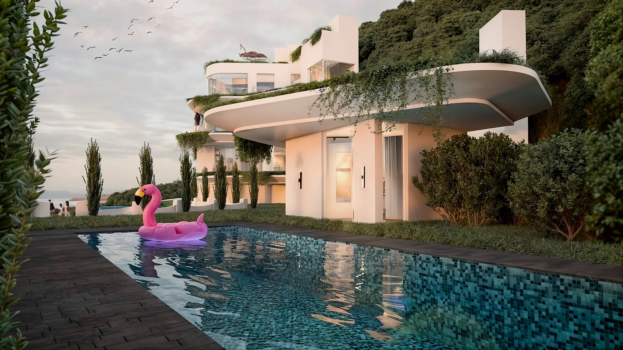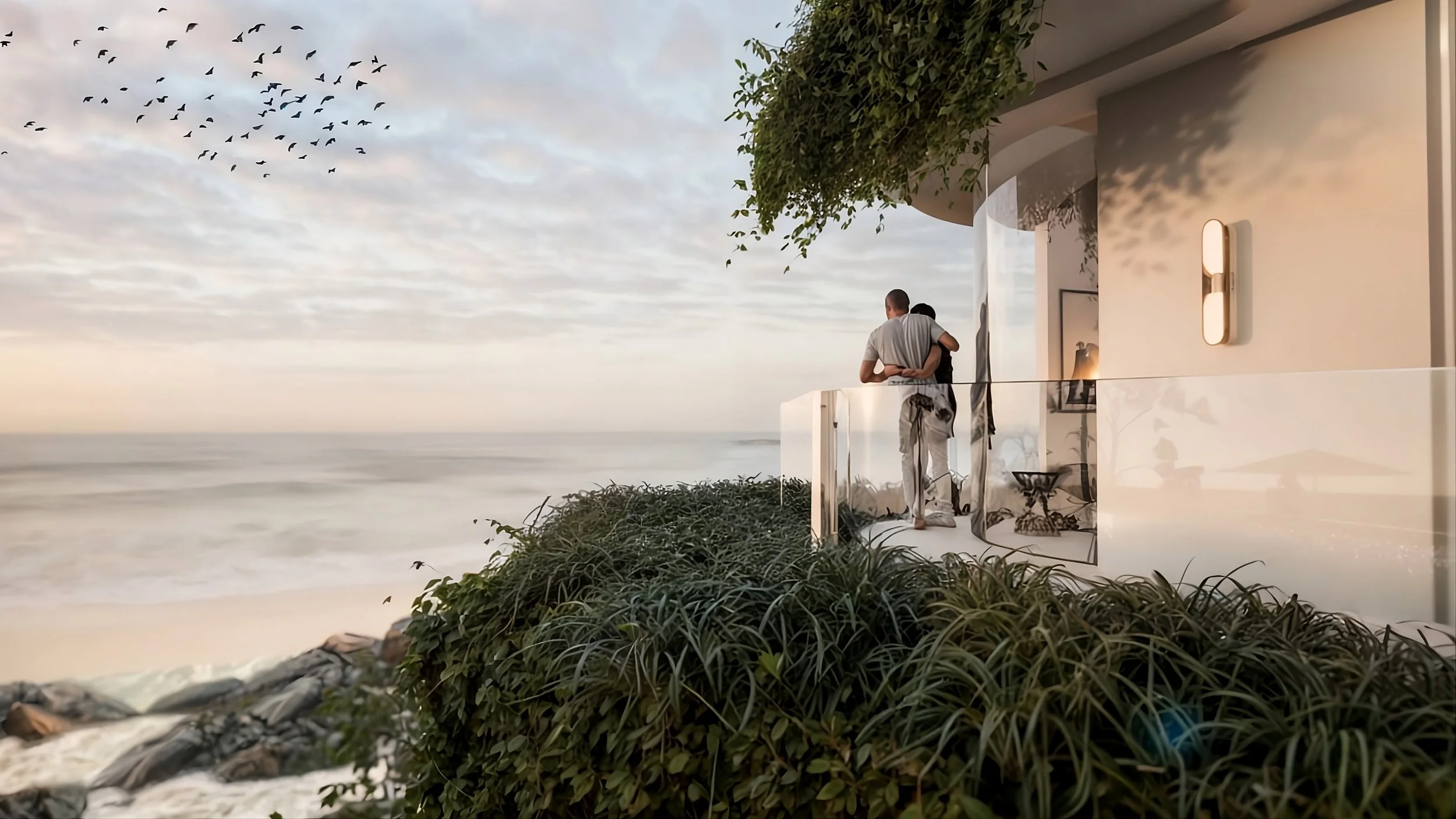 Every major space faces the ocean, holding the sea as a constant presence while the architecture simply frames it. Long stretches of glazing and extended balcony edges draw the eye outward, while planting along every edge softens the lines—greenery spilling over, catching light and shadow, and allowing the building to read less as an object and more as part of a living, coastal edge.