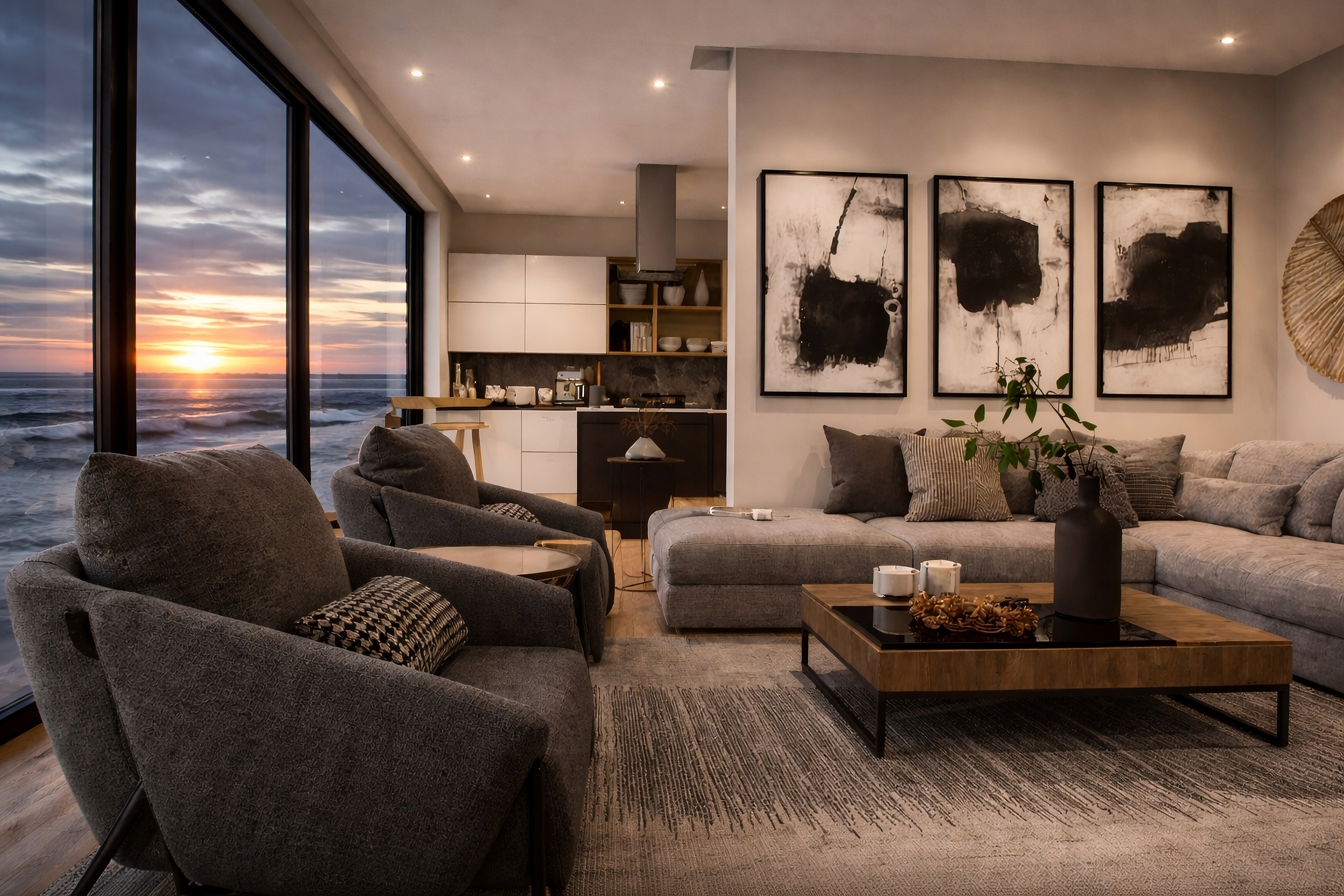 Inside, the space is generous and continuous. Living areas run directly to the glazing, so the ocean becomes a constant backdrop rather than a distant view. Circulation is informal and fluid, with rooms opening into one another in a way that feels natural and unforced. Large openings, restrained materials, and long sightlines keep the interior calm and legible, allowing the scale of the house to read clearly without feeling heavy.